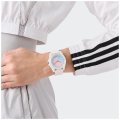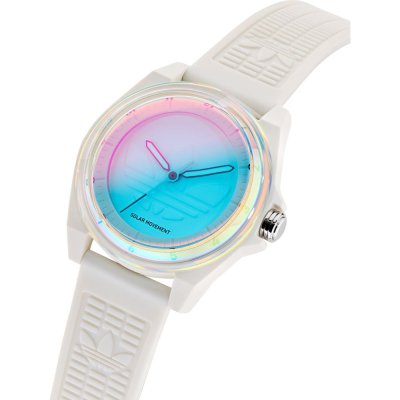 Diese Adidas Uhr hat ein Kunstharz Gehäuse mit einem Durchmesser von 41 mm und ist mit einem Armband aus Kunstharz versehen. In der Uhr arbeitet ein Timex Uhrwerk. Das Glas der Uhr besteht aus Acryl - Glas.