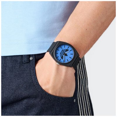 Schwarzes Kunststoffgehäuse Blaues Zifferblatt Schwarzes Kunststoffband