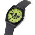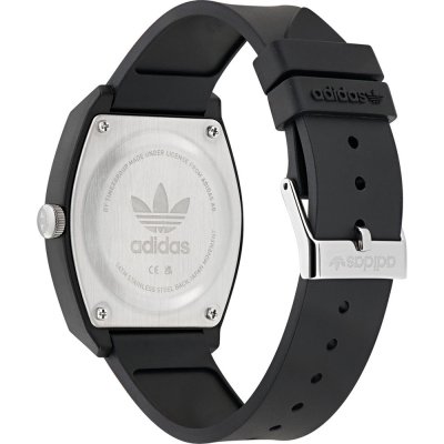 Diese Adidas Uhr hat ein Kunstharz Gehäuse mit einem Durchmesser von 38 mm und ist mit einem Armband aus Kunstharz versehen. In der Uhr arbeitet ein Timex Uhrwerk. Das Glas der Uhr besteht aus Acryl - Glas.