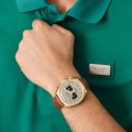 Diese Aston Martin Uhr hat ein Edelstahl Gehäuse mit einem Durchmesser von 43 mm und ist mit einem Armband aus Leder versehen. In der Uhr arbeitet ein Timex Uhrwerk. Das Glas der Uhr besteht aus Mineral - Glas.