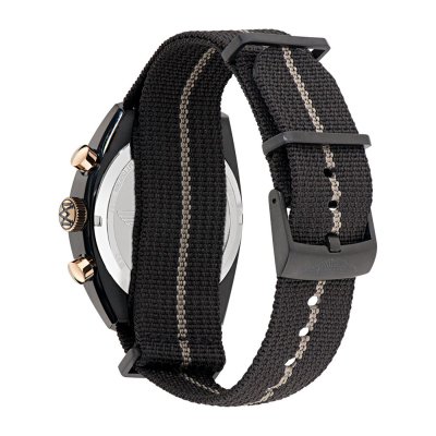 Diese Aston Martin Uhr hat ein Edelstahl Gehäuse mit einem Durchmesser von 43 mm und ist mit einem Armband aus Nylon versehen. In der Uhr arbeitet ein Timex Uhrwerk. Das Glas der Uhr besteht aus Mineral - Glas.