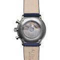 Dieser modernistische und doch klassische Automatik-Chronograph im Fliegerstil kombiniert das stromlinienförmige Bauhaus-Design mit subtilen Details. Zum Beispiel die kleinen, umrissenen Lumen-Punkte bei 3, 6 und 9 Uhr sowie das Dreieck und der Doppelpunkt bei 12 Uhr im klassischen Flieger-Stil. Die goldfarbenen Zeiger kontrastieren mit dem nachtblauen Zifferblatt, auf dem die Hilfszifferblätter dezent eingelassen sind. Die Uhr wird von einem Schweizer Sellita SW500 Uhrwerk mit 25 Steinen und mit 48 Stunden Gangreserve angetrieben.