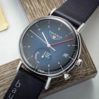 Diese Bauhaus Uhr hat ein Edelstahl Gehäuse mit einem Durchmesser von 41 mm und ist mit einem Armband aus Leder versehen. In der Uhr arbeitet ein Seiko Uhrwerk. Das Glas der Uhr besteht aus K1 Mineral - Glas.