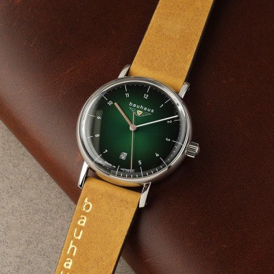 Diese Bauhaus Uhr hat ein Edelstahl Gehäuse mit einem Durchmesser von 36 mm und ist mit einem Armband aus Leder versehen. In der Uhr arbeitet ein Ronda Uhrwerk. Das Glas der Uhr besteht aus K1 Mineral - Glas.