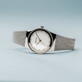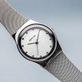 Diese Bering Uhr hat ein Edelstahl Gehäuse mit einem Durchmesser von 27 mm und ist mit einem Armband aus Edelstahl versehen. In der Uhr arbeitet ein Miyota Uhrwerk. Das Glas der Uhr besteht aus Sapphir - Glas.