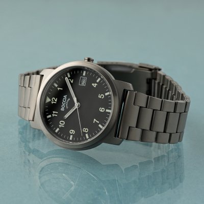 Diese Boccia Uhr hat ein Titan Gehäuse mit einem Durchmesser von 37 mm und ist mit einem Armband aus Titan versehen. In der Uhr arbeitet ein Miyota Uhrwerk. Das Glas der Uhr besteht aus Mineral - Glas.
