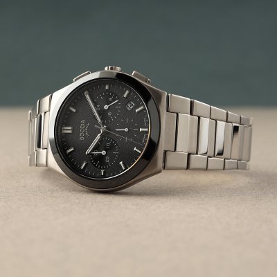 Diese Boccia Uhr hat ein Titan Gehäuse mit einem Durchmesser von 39 mm und ist mit einem Armband aus Titan versehen. In der Uhr arbeitet ein Miyota Uhrwerk. Das Glas der Uhr besteht aus Sapphir - Glas.