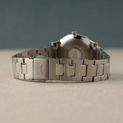 Diese Boccia Uhr hat ein Titan Gehäuse mit einem Durchmesser von 30 mm und ist mit einem Armband aus Titan versehen. In der Uhr arbeitet ein Seiko Uhrwerk. Das Glas der Uhr besteht aus Mineral - Glas.