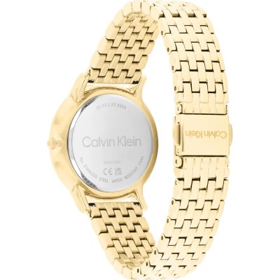 Diese Calvin Klein Uhr hat ein Edelstahl Gehäuse mit einem Durchmesser von 34 mm und ist mit einem Armband aus Edelstahl versehen. In der Uhr arbeitet ein Seiko Instruments Inc. Uhrwerk. Das Glas der Uhr besteht aus Mineral - Glas.