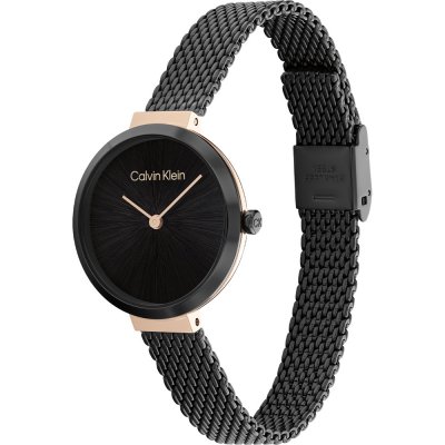 Diese Calvin Klein Uhr hat ein Edelstahl Gehäuse mit einem Durchmesser von 28 mm und ist mit einem Armband aus Edelstahl versehen. In der Uhr arbeitet ein Seiko Instruments Inc. Uhrwerk. Das Glas der Uhr besteht aus Mineral - Glas.