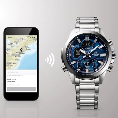Diese Casio Edifice Uhr hat ein Edelstahl Gehäuse mit einem Durchmesser von 46 mm und ist mit einem Armband aus Edelstahl versehen. In der Uhr arbeitet ein Casio Uhrwerk. Das Glas der Uhr besteht aus Mineral - Glas.