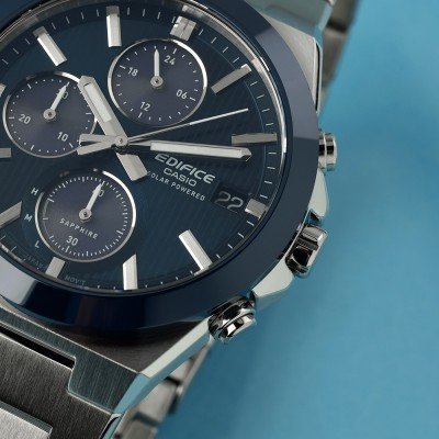 Diese Casio Edifice Uhr hat ein Edelstahl und Karbon Gehäuse mit einem Durchmesser von 41 mm und ist mit einem Armband aus Edelstahl versehen. In der Uhr arbeitet ein Casio Uhrwerk. Das Glas der Uhr besteht aus Sapphir - Glas.