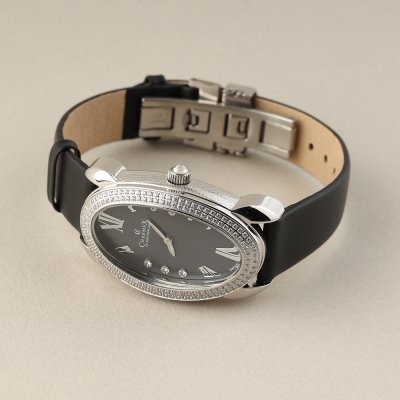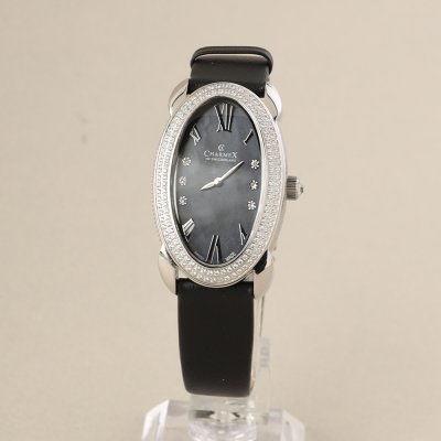 Diese Charmex of Switzerland Uhr hat ein Edelstahl Gehäuse mit einem Durchmesser von 28 mm und ist mit einem Armband aus Satinleder versehen. In der Uhr arbeitet ein Ronda Uhrwerk. Das Glas der Uhr besteht aus Sapphir - Glas.