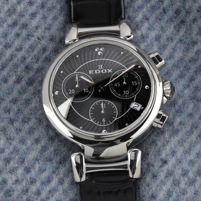 Diese Edox Uhr hat ein Edelstahl Gehäuse mit einem Durchmesser von 35 mm und ist mit einem Armband aus Leder versehen. In der Uhr arbeitet ein Ronda Uhrwerk. Das Glas der Uhr besteht aus Sapphir - Glas.