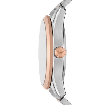 Diese Emporio Armani Uhr hat ein Edelstahl Gehäuse mit einem Durchmesser von 43 mm und ist mit einem Armband aus Edelstahl versehen. In der Uhr arbeitet ein Miyota Uhrwerk. Das Glas der Uhr besteht aus Mineral - Glas.