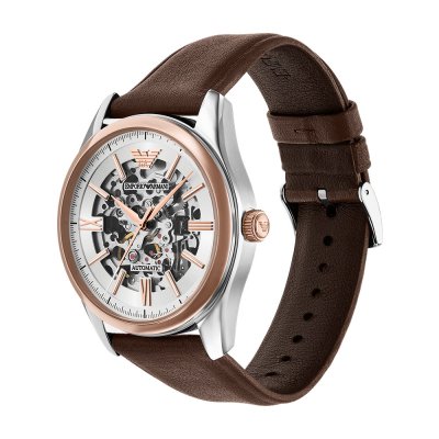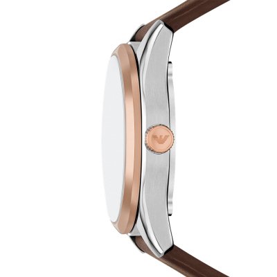 Diese Emporio Armani Uhr hat ein Edelstahl Gehäuse mit einem Durchmesser von 43 mm und ist mit einem Armband aus Leder versehen. In der Uhr arbeitet ein Miyota Uhrwerk. Das Glas der Uhr besteht aus Mineral - Glas.