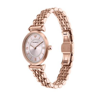 Diese Emporio Armani Uhr hat ein Edelstahl Gehäuse mit einem Durchmesser von 32 mm und ist mit einem Armband aus Edelstahl versehen. In der Uhr arbeitet ein Seiko Instruments Inc. Uhrwerk. Das Glas der Uhr besteht aus Mineral - Glas.