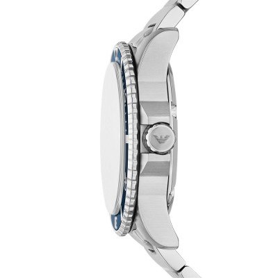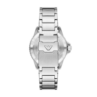 Diese Emporio Armani Uhr hat ein Edelstahl Gehäuse mit einem Durchmesser von 42 mm und ist mit einem Armband aus Edelstahl versehen. In der Uhr arbeitet ein Miyota Uhrwerk. Das Glas der Uhr besteht aus Mineral - Glas.