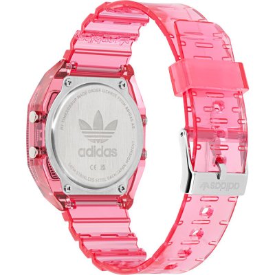 This Adidas watch has a case made of Resin with a diameter of 36 mm and is fitted with a Resin band. Inside the case lies a Timex movement and the watch features a Acrylic crystal.