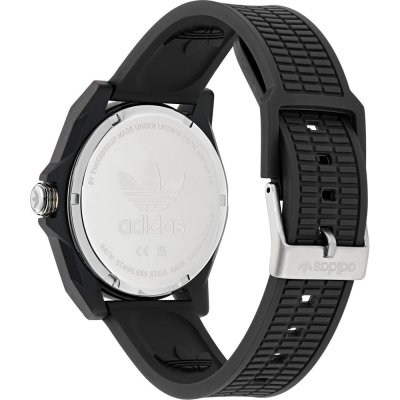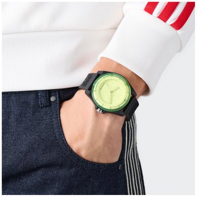 This Adidas watch has a case made of Resin with a diameter of 41 mm and is fitted with a Resin band. Inside the case lies a Timex movement and the watch features a Acrylic crystal.