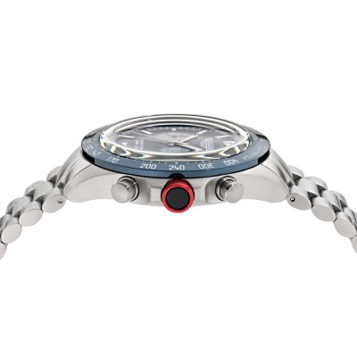 This Aston Martin watch has a case made of stainless steel with a diameter of 44 mm and is fitted with a stainless steel band. Inside the case lies a Timex movement and the watch features a Mineral crystal.