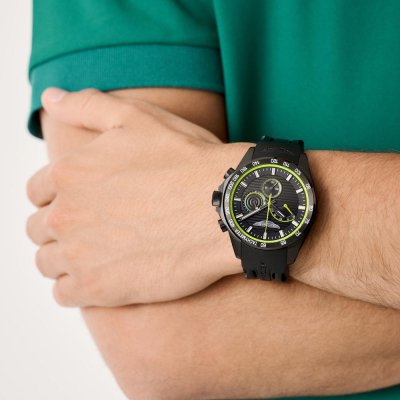 This Aston Martin watch has a case made of stainless steel with a diameter of 44 mm and is fitted with a rubber band.