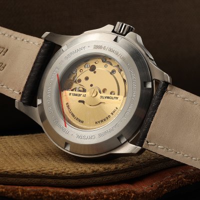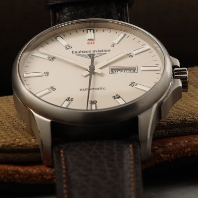 This Bauhaus watch has a case made of titanium with a diameter of 42 mm and is fitted with a leather band. Inside the case lies a Miyota movement and the watch features a Sapphire crystal.