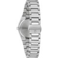 This Bulova watch has a case made of stainless steel with a diameter of 28 mm and is fitted with a stainless steel band. Inside the case lies a Miyota movement and the watch features a Sapphire crystal.