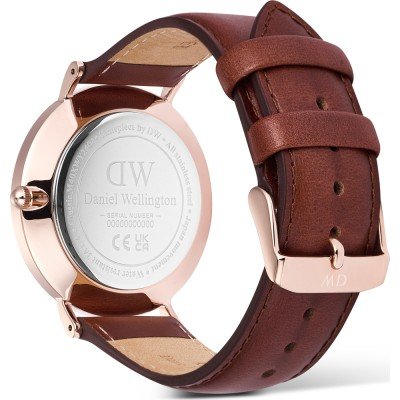 This Daniel Wellington watch has a case made of stainless steel with a diameter of 40 mm and is fitted with a leather band.
