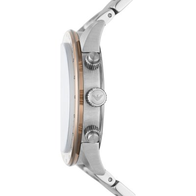 This Emporio Armani watch has a case made of stainless steel with a diameter of 43 mm and is fitted with a stainless steel band. Inside the case lies a Miyota movement and the watch features a Mineral crystal.