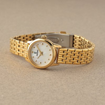 This Festina watch has a case made of stainless steel with a diameter of 23 mm and is fitted with a stainless steel band. Inside the case lies a Miyota movement and the watch features a Mineral crystal.