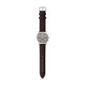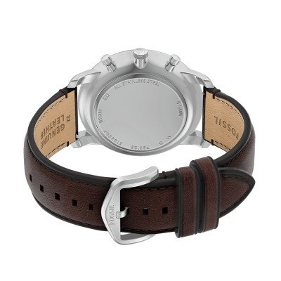 This Fossil watch has a case made of stainless steel with a diameter of 44 mm and is fitted with a leather band. Inside the case lies a Miyota movement and the watch features a Mineral crystal.
