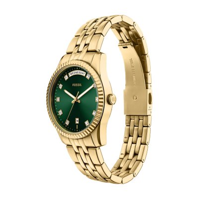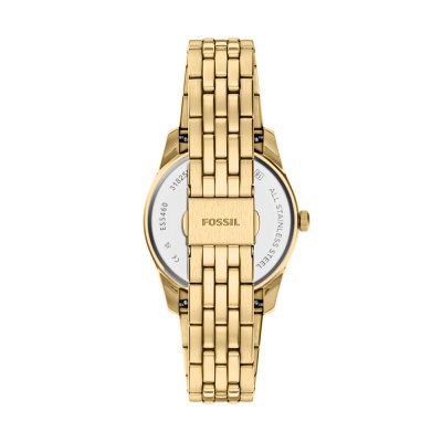This Fossil watch has a case made of stainless steel with a diameter of 34 mm and is fitted with a stainless steel band. Inside the case lies a Seiko Instruments Inc. movement and the watch features a Mineral crystal.