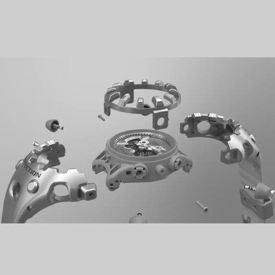 Sometimes you may think there's nothing left to improve on watches in the 21st century, but then you have not been paying attention to G-Shock. After forty years of constant innovation, the brand has once again managed to revolutionize the watch world with a completely unique and original design. With a completely new approach to construction and design, the GA-V01 not only has a spectacular appearance, but it's also supremely shock-resistant and conceals remarkable technical innovations: The case structure, which protects the movement, utilizes an integrated bezel and bracelet construction that partially overlaps the crystal, thus also acting as a bumper to absorb shocks. Casio has also developed a new magnetic hand construction, where the hands, normally vulnerable to impact, are not attached to the axle, but are held in place by magnetic force. This allows them to effectively absorb and dissipate shock. This new technology also allows for the creation of larger, uniquely shaped hands because the axle doesn't have to bear their weight. After a shock or vibration, the hands may temporarily shift out of position, but within a few minutes, they almost magically, return to their original position. The analog-digital dial features a layered construction with a metal face featuring lattice sections, creating decorative glimpses into the interior, and an LCD display. This watch is not for the risk-averse. It's striking, large, and sure to get people talking! And you're guaranteed a strong and powerful movement that keeps working, no matter whatever shocks and impact it may encounter!