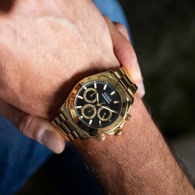 This Guess watch has a case made of stainless steel with a diameter of 42 mm and is fitted with a stainless steel band. Inside the case lies a Seiko Instruments Inc. movement and the watch features a Mineral crystal.