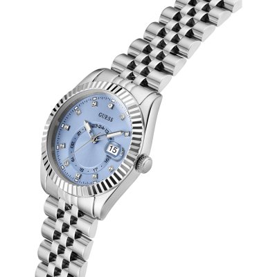 This Guess watch has a case made of stainless steel with a diameter of 34 mm and is fitted with a stainless steel band. Inside the case lies a Seiko Instruments Inc. movement and the watch features a Mineral crystal.
