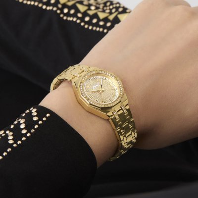 This Guess watch has a case made of stainless steel with a diameter of 25 mm and is fitted with a stainless steel band. Inside the case lies a Seiko movement and the watch features a Mineral crystal.