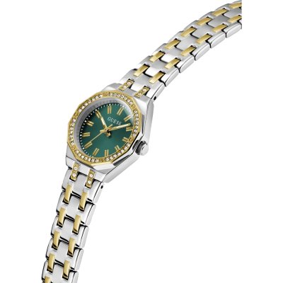 This Guess watch has a case made of stainless steel with a diameter of 25 mm and is fitted with a stainless steel band. Inside the case lies a Seiko movement and the watch features a Mineral crystal.