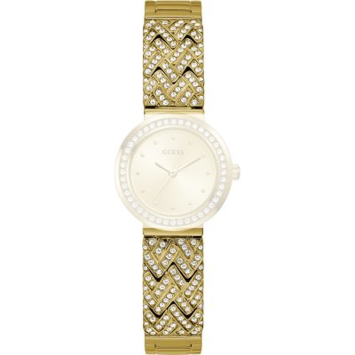 This Guess watch strap is made of metal and is attached to the watch by means of steel pins. The band has a width of 14 mm and is closed by means of a jewelry clasp. The strap has no straight mount which means that this strap is only suitable for the watches listed below.