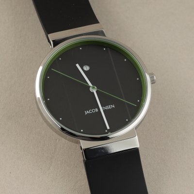 This Jacob Jensen watch has a case made of stainless steel with a diameter of 35 mm and is fitted with a rubber band. Inside the case lies a Ronda movement and the watch features a Mineral crystal.