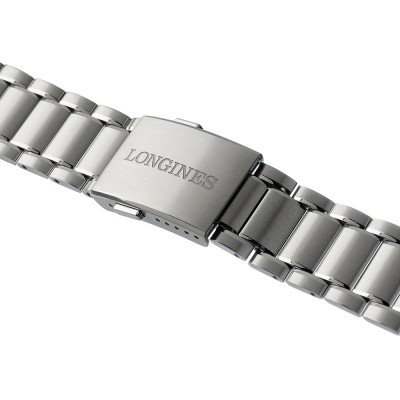 This Longines watch strap is made of stainless steel and is attached to the watch by means of pushpins. The band has a width of 22 mm and is closed by means of a deployment clasp with push buttons. The strap has no straight mount which means that this strap is only suitable for the watches listed below.