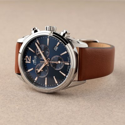This Lotus watch has a case made of stainless steel with a diameter of 42 mm and is fitted with a leather band. Inside the case lies a Miyota movement and the watch features a Mineral crystal.