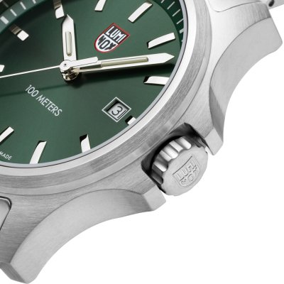 This Luminox watch has a case made of stainless steel with a diameter of 43 mm and is fitted with a stainless steel band. Inside the case lies a Ronda movement and the watch features a Single anti-reflective sapphire crystal.