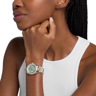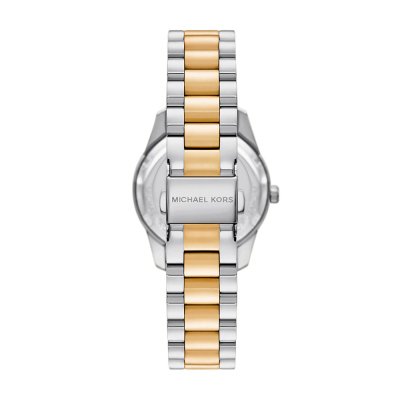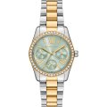 This Michael Kors watch has a case made of stainless steel with a diameter of 34 mm and is fitted with a stainless steel band. Inside the case lies a Miyota movement and the watch features a Mineral crystal.