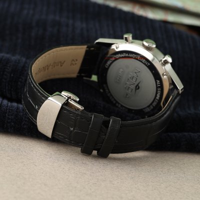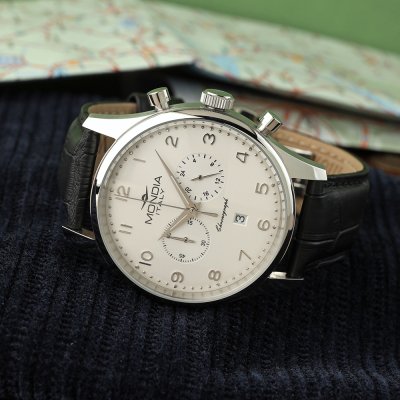 This Mondia watch has a case made of stainless steel with a diameter of 43 mm and is fitted with a leather band. Inside the case lies a Miyota movement and the watch features a Mineral crystal.
