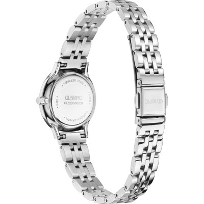 This Olympic watch has a case made of stainless steel with a diameter of 26 mm and is fitted with a stainless steel band. Inside the case lies a Seiko Instruments Inc. movement and the watch features a Mineral crystal.