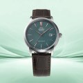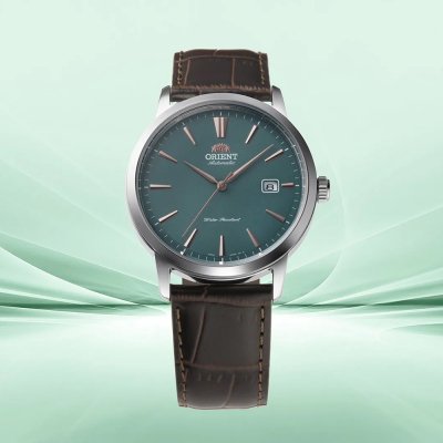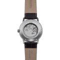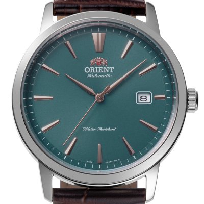 This Orient watch has a case made of stainless steel with a diameter of 42 mm and is fitted with a leather band. Inside the case lies a Orient movement and the watch features a Mineral crystal.