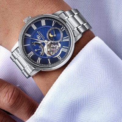 The mechanical Classic M45 is based on the Mechanical Moon Phase watch from 2017. The major update on this watch is the design of the moon phase. The moon’s backdrop has been changed to a vibrant, deep-blue-colored night sky, and the stars appear sharper due to improved brightness. In addition, the curved sapphire crystal now features anti-reflective (SAR) coating on both sides, which blocks approximately ninety-nine percent of reflections. This gives the watch the impression of having no crystal at all. Also, the Orient Star logo - positioned in the center of the dial - is only visible depending on the angle of light. The in-house F7M42 automatic movement with 50 hours power reserve an beautifully guilloche rotor is visible through the case back, making this 45 a complete and beautifully detailed moon phase watch.