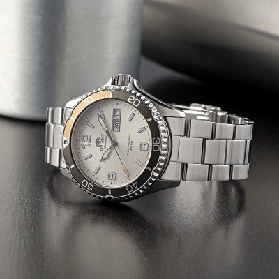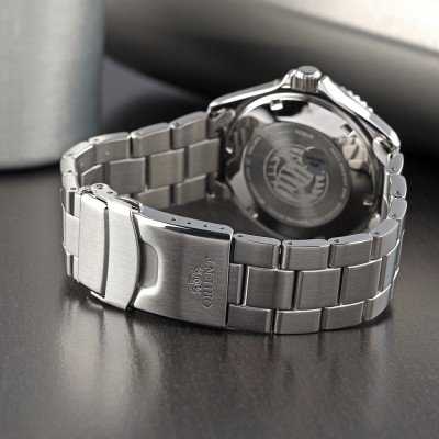 This Orient watch has a case made of stainless steel with a diameter of 41.8 mm and is fitted with a stainless steel band. Inside the case lies a Orient movement and the watch features a Sapphire crystal.