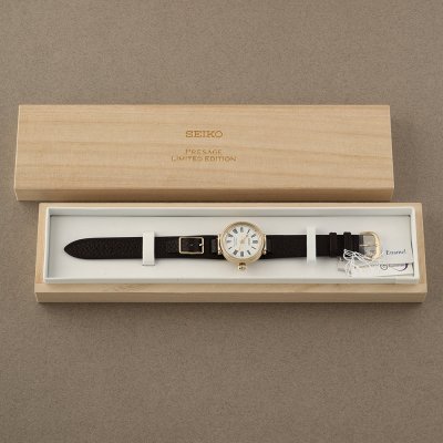 To celebrate their 145th anniversary, Seiko released this beautiful Presage watch, inspired by a classic Seiko pocket watch called ‘Timekeeper type 17’. It is a Limited Edition watch with gold accents, celebrating Seiko's enriching life with joy and beauty. Like the pocket watch, it features an onion-shaped crown, and a bezel adorned with intricate details, to echo the silhouette of the historic timepiece. And like the original, this watch features a hand made white enamel dial, the uneven surface of which is unique, no two are exactly alike. It is marked with classic Roman numerals ensuring high legibility, while the box-shaped crystal adds depth to the design. As a member of the Leather Working Group (LWG) Seiko sourced the strap from a sustainable LWG-certified tannery.